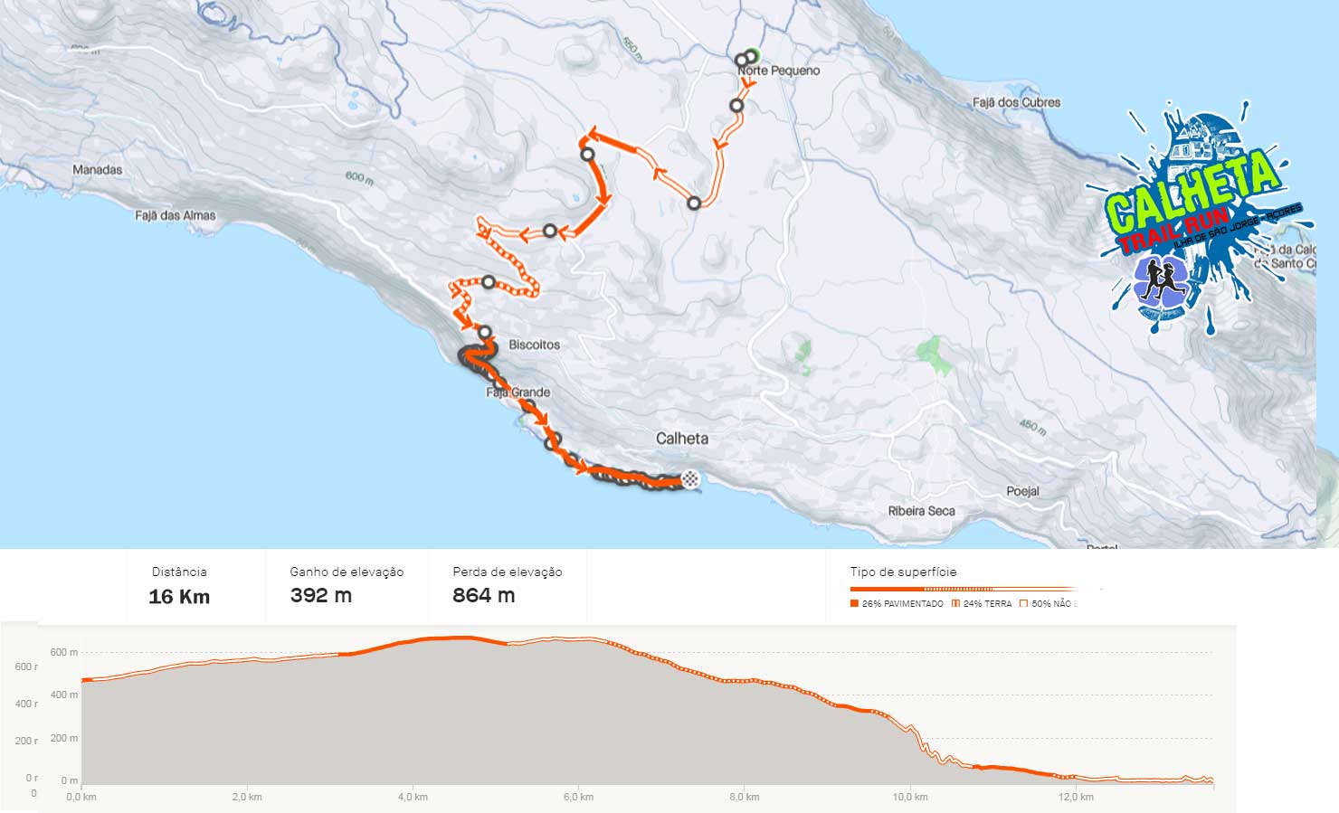 A "CAMINHADA" tem uma extensão de 16 Km com início na Freguesia de Norte Pequeno e Final na Vila da Calheta na Ilha de São Jorge - Açores. O percurso é realizado em terreno misto de alcatrão e terra batida.